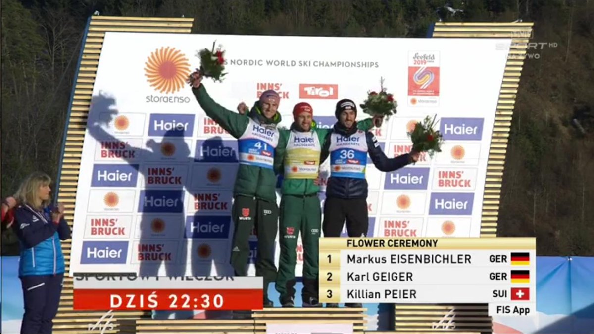 E jak Eisenbichler Markus - mistrz świata ze skoczni dużej. Niemcom znakomicie dopisała forma i wystrzelili na Bergisel w Innsbrucku. Markus Eisenbichler był najlepszym z nich, zdobywając tytuł mistrzowski, a jednocześnie będąc drugim zawodnikiem po Roku Benkoviciu, który został mistrzem świata, nie posiadając ani jednego triumfu w Pucharze Świata. Skoki Eisenbichlera były znakomite, latał dalej od rywali, a medale rozstrzygnęły się tak naprawdę między nim, Karlem Geigerem i prowadzącym po pierwszej serii Killianie Peierze, który zrobił małą sensację na tych mistrzostwach. Ale drugi skok Szwajcara pozwolił Eisenbichlerowi na radość ze złota. Czy obroni złoto w Oberstdorfie? Jeżeli jego dyspozycja nadal będzie taka sama, to kto wie!