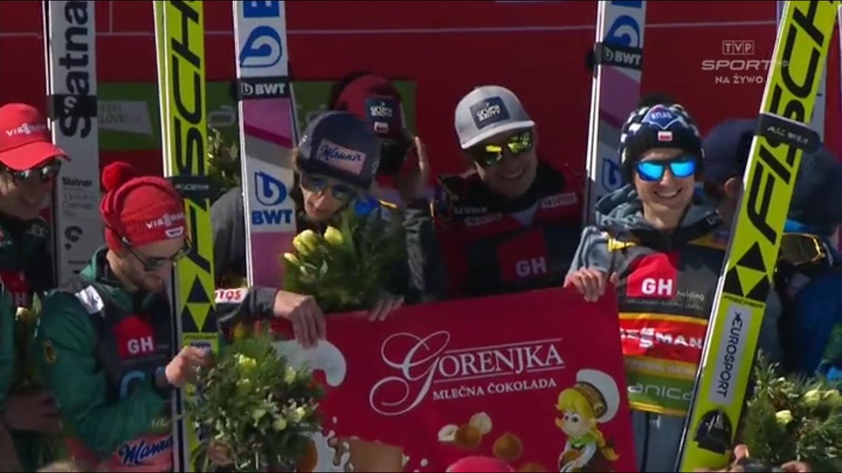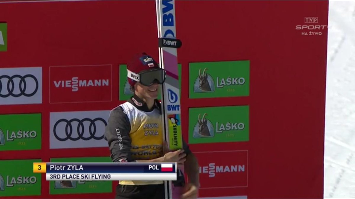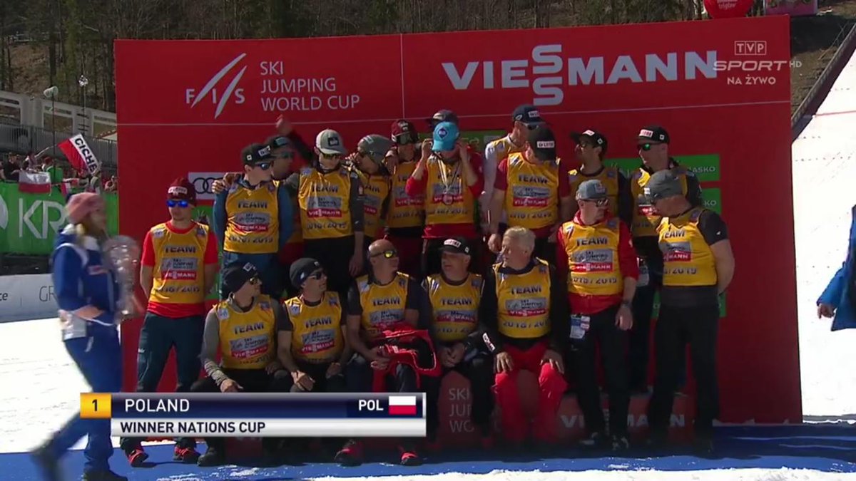 P jak Polska - triumfatorzy Pucharu Narodów. Wygrywamy ten puchar drugi (i pewnie ostatni) raz, zdobywając 6083 pkt. Zawdzięczamy ten triumf słabszej dyspozycji Niemców (bo tak naprawdę z nimi tylko biliśmy się o triumf w tym sezonie) i dużej ilości konkursów, w których komplet zawodników naszej reprezentacji punktował. I to wcale nie w trzeciej dziesiątce, a w pierwszej i drugiej. Kamil Stoch wygrał tylko dwa razy, ale za to był razem z Piotrem Żyłą i Dawidem Kubackim wiele razy na podium. Stoch, Żyła i Kubacki także znaleźli się dzięki temu na 3,4 i 5. miejscu klasyfikacji generalnej Pucharu Świata. Poza tym, wygraliśmy trzy konkursy drużynowe. Wisła, Willingen i Planica stały się naszymi szczęśliwymi miejscami. Odjechaliśmy Niemcom, którzy na moment nas przegonili w Predazzo, ale potem my znowu powiększaliśmy i traciliśmy przewagę, którą dowieźliśmy ostatecznie do Planicy. Licznik tej przewagi stanął na 433 pkt. Brawo, Polacy! Będzie ciężko obronić te trofeum, ale jeżeli w następnym sezonie znajdziemy się na podium tej rywalizacji to będzie bardzo miło! Aczkolwiek 2 i 3 miejsce nie fetuje na podium wPlanicy Vikersund w 2020