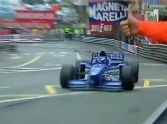 Grand Prix Monako 1996 - jeden z najciekawszych wyścigów w historii tej rundy w kalendarzu Formuły 1. Piąta runda sezonu. 22 kierowców startowało, a do mety dojechało tylko trzech, choć sklasyfikowano siedmiu. Było deszczowo, a w końcówce dystansu tor przesychał. Z PP startował Michael Schumacher, który z wyścigu wypadł na pierwszym okrążeniu. Potem prowadził Damon Hill (późniejszy mistrz świata), któremu wybuchł silnik. Następnie prowadził Jean Alesi przez dłuższy czas, by dopadła go awaria, a wtedy prowadzenie objął Francuz Olivier Panis z Ligiera. Prowadzenia nie oddał do mety, którą wymierzył czas, czyli limit dwóch godzin. Przejechał wobec tego 76, nie 78 okrążeń. Była to pierwsza wygrana dla Ligiera od prawie 15 lat i wygranej w Kanadzie Jacquesa Lafite'a. Zarazem był to ich ostatni triumf w Formule 1, bo zespół po sezonie został sprzedany Alainowi Prostowi. Sam Panis punktował w tym sezonie trzy razy, oprócz Monako zdobył punkt za P6 w Brazylii i dwa punkty za P5 na Węgrzech. Podium uzupełnili David Coulthard z McLarena i Johnny Herbert z Saubera. Elitarne grono sześciu punktujących zaszczycili także Heinz-Harald Frentzen (wycofał się z wyścigu około 1,5 minuty przed końcem), Mika Salo (odpadł na skutek wspomnianej później kolizji) i Mika Hakkinen. Szans na podium i punkty pozbawił się Eddie Irvine, który wpadł w poślizg zakręt przed tunelem, eliminując z wyścigu siebie, a także "parkujących" w jego aucie Mikę Hakkinena i Mikę Salo.