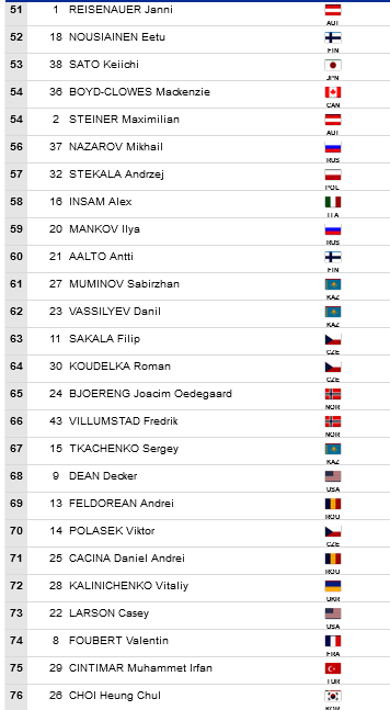 A w kwalifikacjach, gdzie były mgła i śnieg (w konkursie też!) triumfował Ryoyu Kobayashi. Nadal wymiatał, w końcówce warunki zelżały i mógł odfrunąć na 141,5m! 3200 franków znowu było jego. Para z Trofimowem też nie była wielkim wyzwaniem. Lindvik był drugi, a za nim Tande. Lindvik skoczył 139,5m. Granerud i Geiger uzupełnili TOP5, a w dziesiątce byli też Wellinger czy Sadrejew. Szybko dorasta ten Sadrejew. Czterech Polaków awansowało, Stękała nie, ale za to Żyła P16 (128m, vs. Wohlgenannt), Wąsek P28 (126m vs. Peier), Wolny P37 (123m vs.Mogel), Kubacki P48 (117m vs. Tande). Czesi odpadli, Cintimar także, ale Ipcioglu awansował. Cintimar, Vaskul i Choi skakali na potężnym poziomie 80-78m!