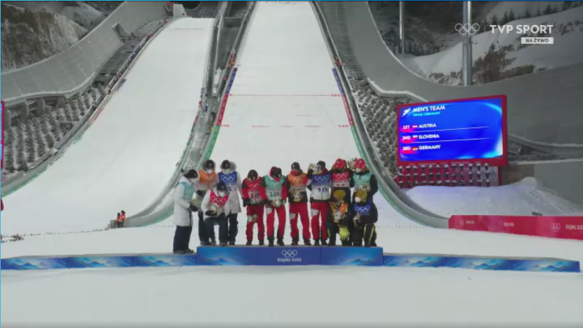 Kto ozłocony? Austria po 12 latach przerwy. Wtedy zrobił to skład Schlierenzauer, Morgenstern, Loitzl i Kofler. Tym razem byli to Kraft, Huber, Hoerl i Fettner. Tak, 36-letni Fettner zdobył złoty medal. Najdalej latał Hoerl - 133/137,5m. Skok z drugiej serii był najważniejszy dla tego złotego medalu, choć i 128m Fettnera było tak samo ważne, bo przypieczętowało ten sukces. Fettner w pierwszej rundzie skoczył tyle samo, wtedy Austria była druga po pierwszej rundzie. Huber skakał 130,5/129m, a Kraft 129,5m/121,5m. Ten drugi skok Krafta był maksem na tamte warunki. Austria jest złota, wielki sukces po tylu latach przerwy. No i Kraft ma złoto na igrzyskach. Tak jak Słowenia srebro, niczym kadra Jugoslawii w Calgary w 1988 roku. Mieli nawet szansę na złoto, jednak szansę pogrzebał drugi skok i Lovro Kosa, i Timiego Zajca. 120 i 126m nie mogły dać tych szans. Jednak to do Kosa należy najdalszy skok Słowenii w konkursie - 134m. Zajc w pierwszej próbie miał 124m. Peter Prevc 129/127, a najrówniejszy był jego brat, Cene - 132m razy dwa. Słowenia ze srebrem, ale jeden dalszy skok mógł dać im złoto.
