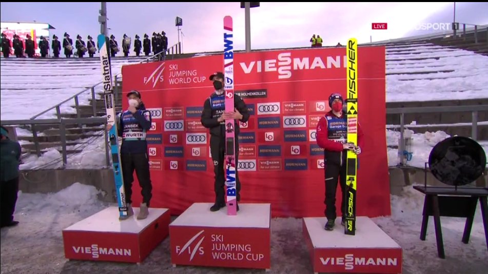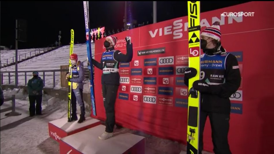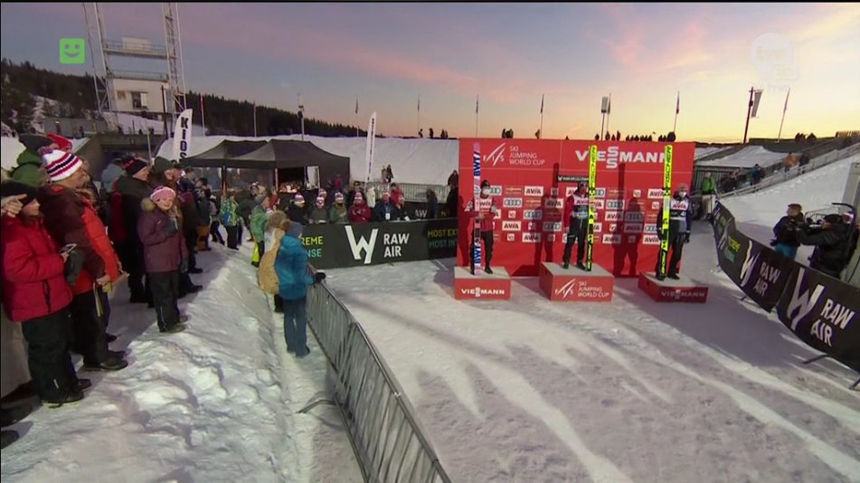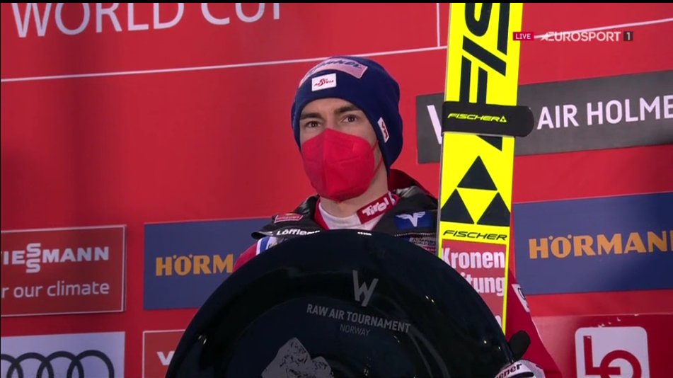 Kto wygrał? Daniel-Andre Tande. Ósmy triumf w karierze po tylu perturbacjach i upadkach na pewno smakuje niesamowicie. 128,5 i 133,5m. Drugi skok dał mu atak na wygraną z 3. miejsca po pierwszej serii. I to był atak skuteczny, bo tak dalekim skokiem na Holmenkollbakken da się zwojować zwycięstwo, szczególnie jeśli jest to skok w ostatniej piątce konkursu. Wzruszający moment, który da mu dużo motywacji do dalszych treningów. i powrotu do walki w czubie stawki. No i, co ważne, Norwegia od 2018 roku niepokonana na Holmenkollbakken w konkursach indywidualnych. Seria przedłużona, okazja do jej zakończenia w przyszłym roku. Lanisek wrócił na podium! Drugi w konkursie, 130,5/131,5m. Najlepszy dzień Słoweńca od paru tygodni w Pucharze Świata. Solidny występ. Tak jak trzeci Kraft - 131,5/128,5m. Zapewnił sobie przy okazji triumf w Raw Air, 79. podium w karierze. Powinien na luzie dogonić Ammanna i Stocha w tym sezonie. Czwarty był Eisenbichler - w drugiej próbie odleciał na 135,5m, co jest najdalszym skokiem w ten weekend w PŚ w skokah. Świetna próba, ale i tak to było zbyt mało, by stanąć na podium w niedzielę.